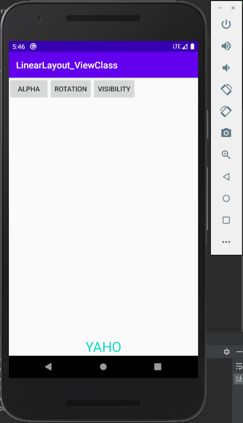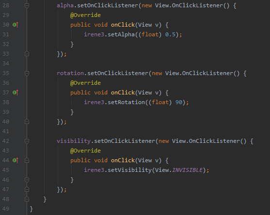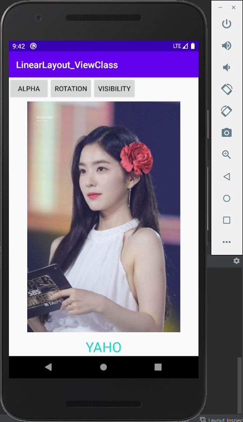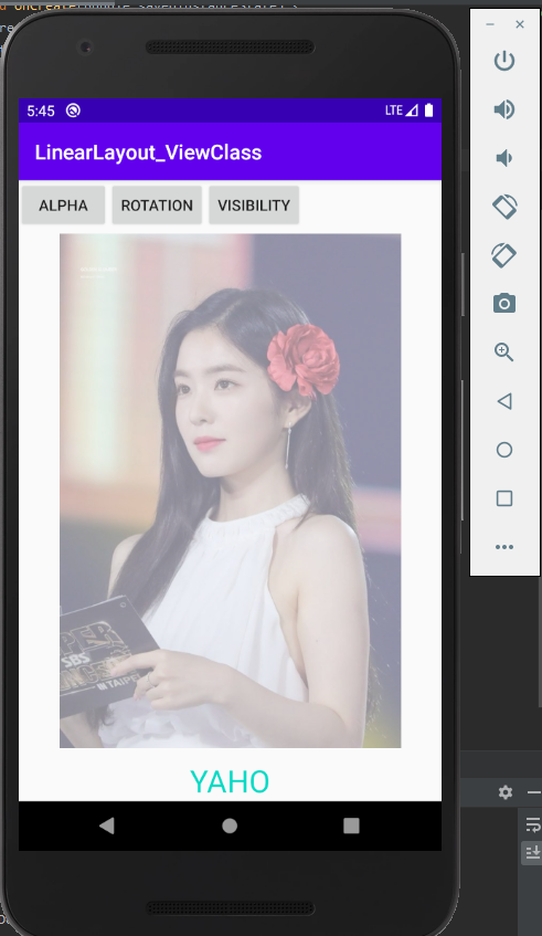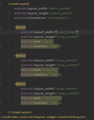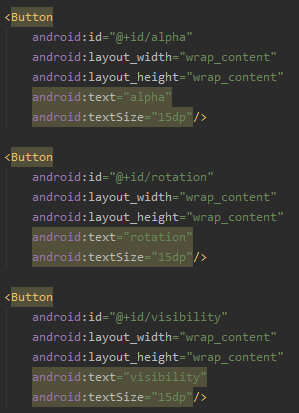 위 처럼 코드를 수정해서 넣으면 이렇게 완성된다. id 속성은 안 써도 상관없는 줄 알았는데 버튼에 alpha, rotation, visibility 기능을 넣으려면 java 코드를 작성해야하는 것 같다