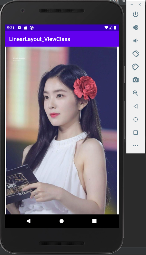 이미지 뷰의 layout_width, layout_height 속성의 속성 값을 wrap_content(뷰의 크기에 따라 이미지 크기가 결정된다.) 으로 통일해 주었다. 스마트폰의 화면 전체를 이미지 뷰가 채운 상태다.