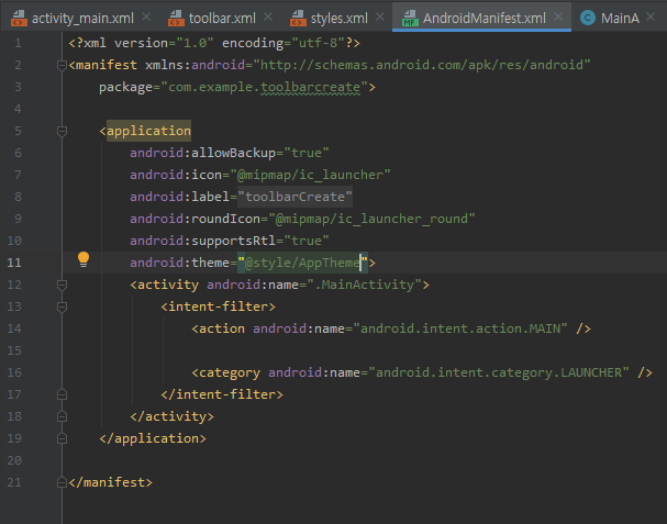 툴바를 사용할 때는 android:theme="@style/AppTheme"을 사용하지 않을 때는 android:theme="@style/Theme.AppCompat.Light.NoActionBar" 로 지정하면 된다.