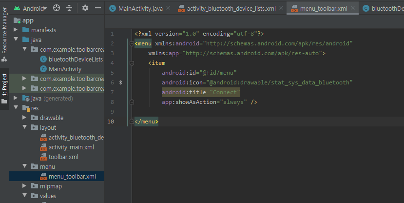 android:icon에 기본 블루투스 모양이 있어서 아이콘을 등록했다. showAsAction은 노출 여부다. 블루투스 연결을 위해 항상 있어야 해서 always로 했다.