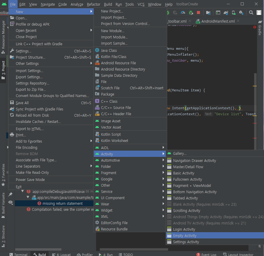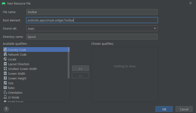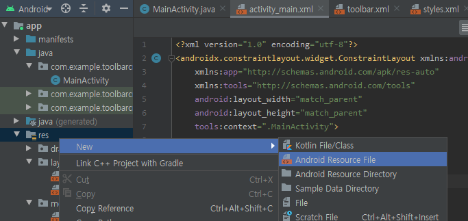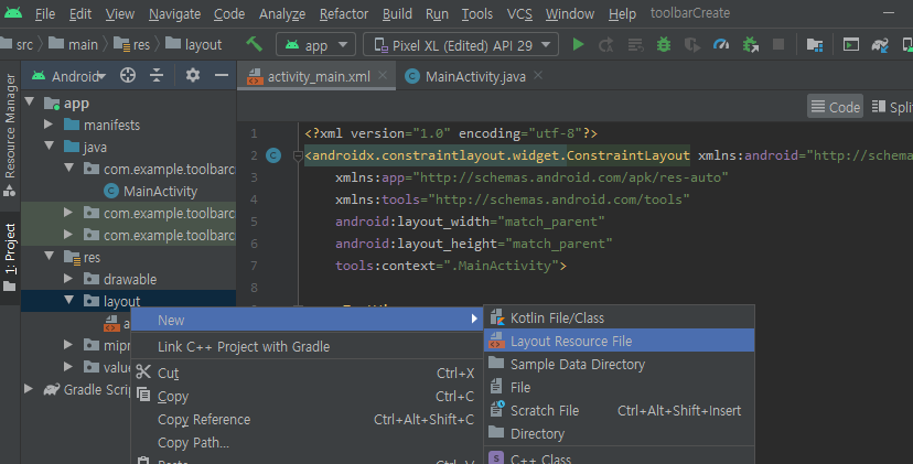 ① res/layout 디렉토리에 툴바 리소스 파일 생성
