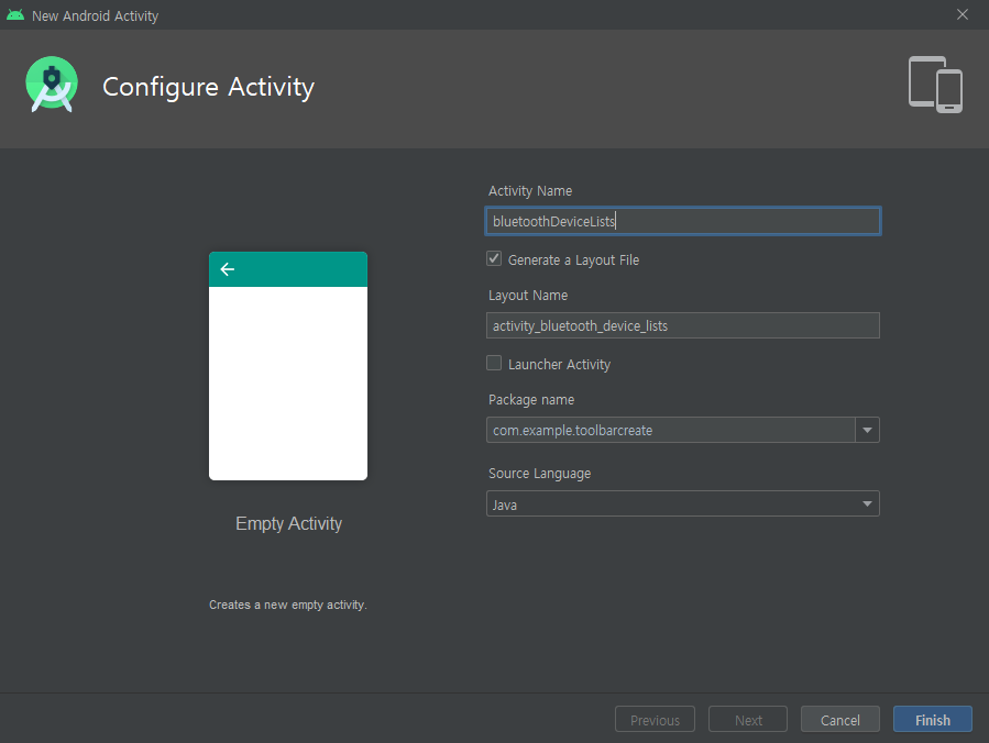 새로 생긴 클래스와 xml 파일에는 툴바에 있는 블루투스 버튼을 눌렀을 때 새액티비티로 이동하는 것을 만들어준다.