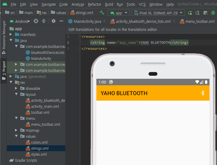 만약 툴바에 쓰여있는 toolbarCreate 문자를 바꿔주고 싶다면 res/values/string.xml 에서 수정하면 된다.