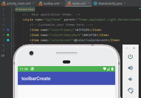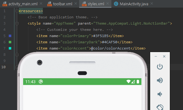 activity_main.xml 파일에 아까 layout 디렉터리 안에 작성한 toolbar.xml 경로를 알려준다. 그러면 toolbar.xml 에서 background로 지정한 색이 툴바 배경색으로 출력된다.