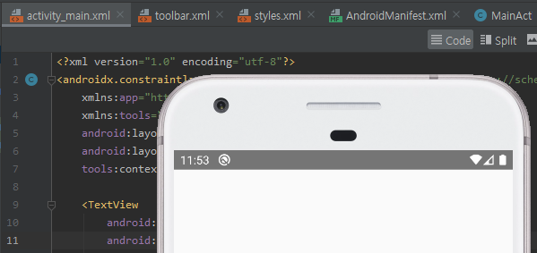 ○ 4. activity_main.xml 파일에 툴바 리소스 파일 등록