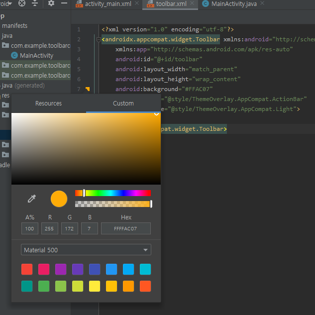 background는 툴바의 배경색이니 쓰고 싶은 색을 골라 쓰면 된다.