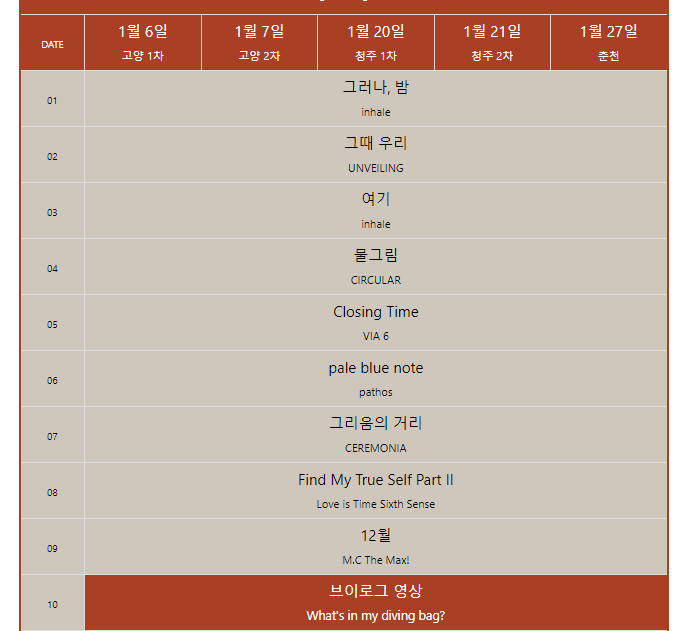 1부에서 3번째 곡이 inhale 앨범의 여기였는데 하이라이트 부분에서 입이 떡 벌어지면서 헉 누가 기량 떨어졌다했어! 하면서 긴장은 놓고 설렘 가득으로 관람했던 것으로 기억이 난다. 끝나고 나서는 무슨 노래에 그렇게 긴장을 놨더라? 했는데 다시 셋 리스트를 돌려보면서 알게 됐다.(다른 지역의 셋 리스트도 크게 다르지 않다! 게스트가 있었던 서울을 빼곤ㅜ)