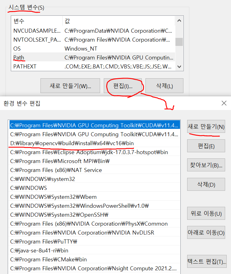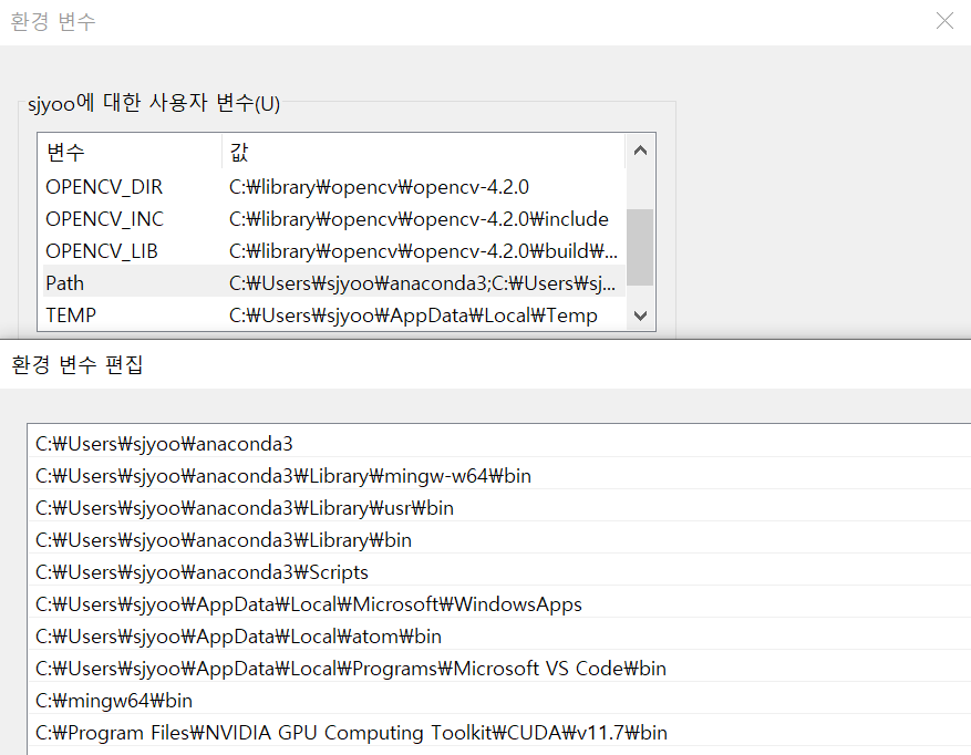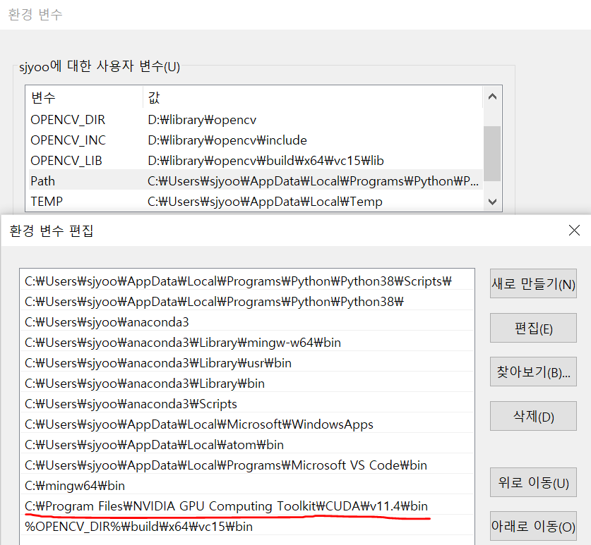 설치 후 - CMD(WINDOW 버튼 + R) - 시스템 환경 변수 편집 - 사용자 변수 - PATH - 편집 - C:\Program Files\NVIDIA GPU Computing Toolkit\CUDA\v11.4\bin 추가