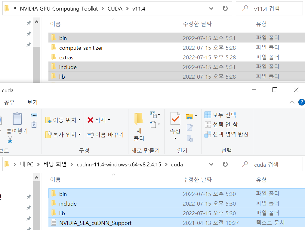 cuDNN의 다운로드한 파일 bin, include, lib을 CUDA 디렉터리에 모두 덮어쓰기 하면 된다.