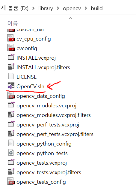 설치를 완료하고, 빌드 경로인 D:\library\opencv\build 디렉터리에 OpenCV.sln 솔루션 파일이 있다.