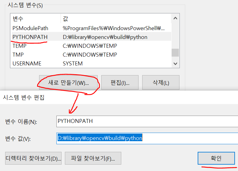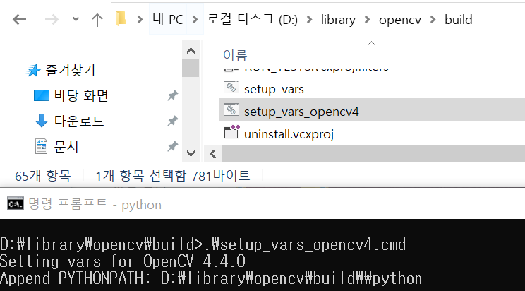 빌드를 완료했던 D:\library\opencv\build 디렉터리에 보면 setup_vars_opencv4.cmd 파일이 있는데, 이 파일을 CMD에서 실행하면 PYTHONPATH가 나온다. 위 경로를 시스템 환경 변수 편집의 시스템 경로에 등록하자.(CMD에서 D드라이브로 넘어가는 방법은 cd를 빼고 D: 만 입력하면 된다.)
