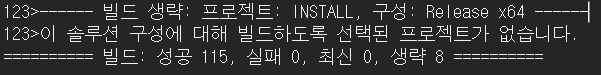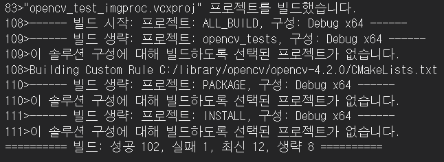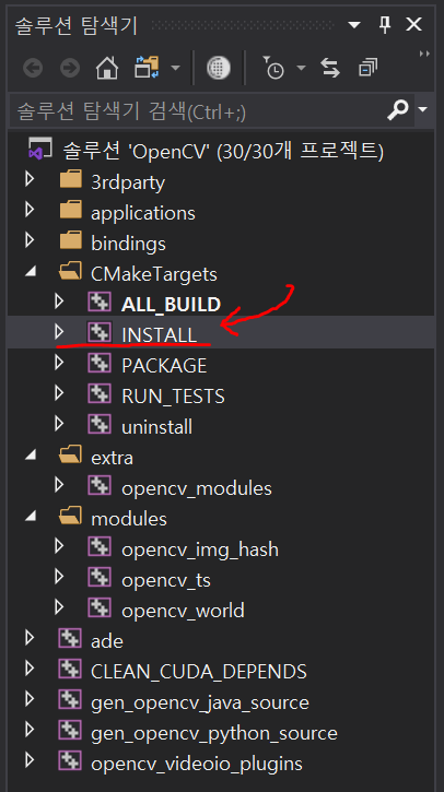 솔루션 'OpenCV'를 빌드하는데 디버그, 릴리즈 모드 각각 해준다. 그리고 왼쪽 탐색기에 있는 CMakeTargets 디렉터리에 INSTALL 이라는 것이 있으니 이도 디버그, 릴리즈 모드 각각 INSTALL 한다. INSTALL 하면 x64 디렉터리에 디버그, 릴리즈 모드 각각 빌드-INSTALL 로그가 남을 것이다.