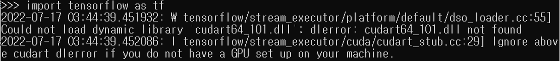 이 에러는 Tensorflow-gpu 버전이 지원하는 CUDA는 10.1 버전인데 내가 다른 버전을 설치했을 때 나오는 에러이다. 위에 표를 보고 Tensorflow-gpu가 지원하는 CUDA 버전을 설치하여 사용하자. 구글링에는 해당 파일을 따로 다운로드해서 CUDA Toolkit 디렉터리에 넣어주면 되는다는데 권장하는 방법은 아니라고 생각한다.