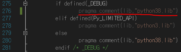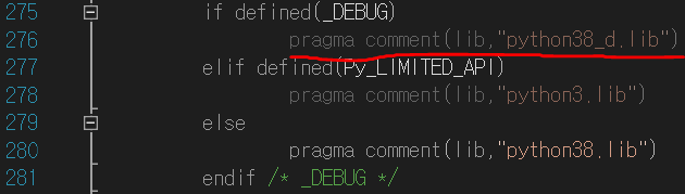 위 블로그에서 나와있는 것처럼 디버그 모드에서도 python38.lib를 사용할 수 있도록 Python 경로의 pyconfig.h, object.h의 구문을 수정해준다.