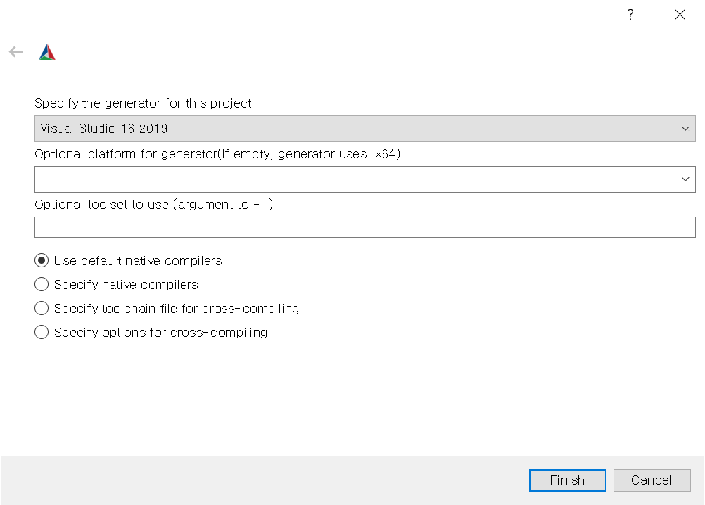 Configure -> compiler로는 Visual Studio 버전 선택