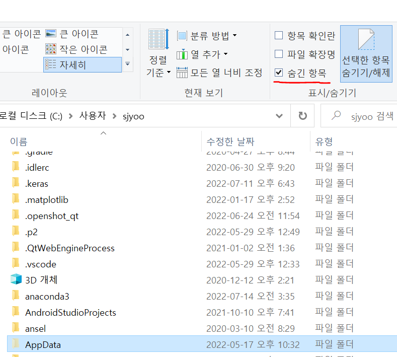 AppData 디렉터리는 숨김 항목으로 지정되어 상단 탭의 보기를 눌러서 숨긴 항목도 볼 수 있도록 한다.