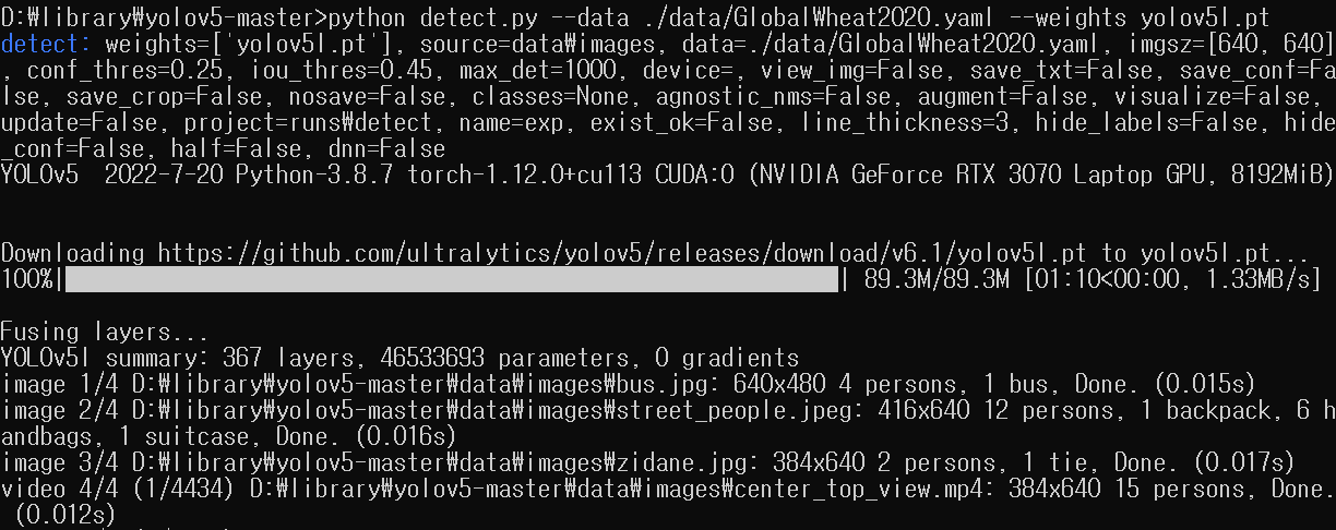 위에서 옵션을 보았을 때는 weights에 관한 옵션이 없었으나 --weights와 함께 사전 훈련된 모델 파일명을 적어 넣으면 위와 같이 실행이 된다. 기본값인 yolov5s.pt 파일은 이미 있어서 다운로드 없이 실행이 되는 것이었고, 이른 Large의 l모델로 바꿔 실행하니 YOLOv5 깃허브 주소에서 자동으로 다운로드되는 것을 볼 수 있었다. [pt 확장자는 pre-trained의 줄임말로 사전 훈련된 모델 파일을 의미한다.]