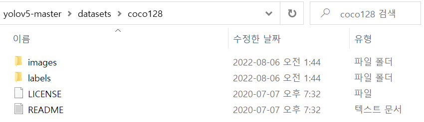 YOLOv5의 기본 데이터 세트인 coco128을 다운로드하면 위와 같이 images, labels 디렉터리 두 개가 나온다.