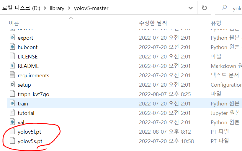다운로드 한 pt 확장자 파일은 YOLO 디렉터리 가장 하단에 다운로드된다.