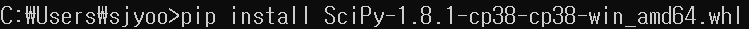 설치 전에 Python 버전을 확인하고 다운로드하자. Python 3.8 버전에 맞는 Scipy 버전을 다운로드해야 하기 때문이다. 위에서 파일을 다운로드하고 파일을 cmd 위치에 맞춰주거나 cmd에서 'cd' 명령어로 파일의 위치를 맞춰주자.