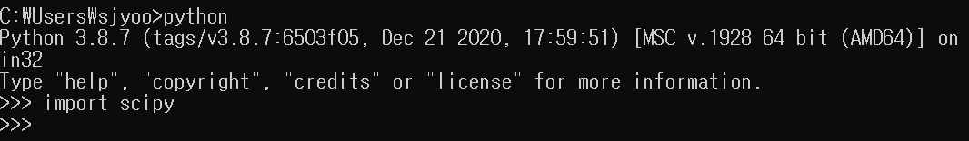 Python, Tensorflow는 설치가 되어있는 상태인데, Scipy는 설치됐는지 모르겠다. cmd에 가서 import scipy로 모듈이 설치되었는지 확인할 수 있다.