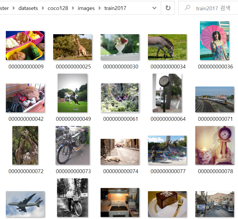 images 디렉터리와 labels 디렉터리에는 각각 학습에 필요한 128개의 이미지와 이미지에 표시한 라벨링 좌표와 물체(클래스) 번호가 담겨있다.
