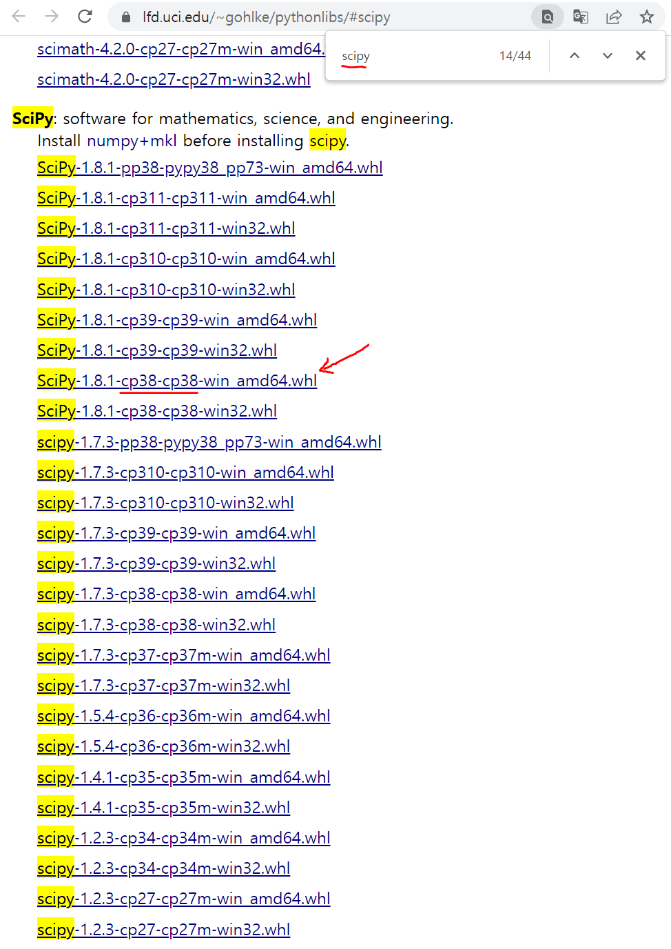 다양한 Python 모듈을 설치할 수 있는 모듈 다운로드 사이트이다. Scipy는 아래쪽에 있으니 Ctrl+f로 찾아서 다운로드하자.