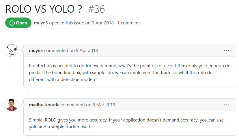 ROLO는 Recurrent YOLO의 약자로, YOLO와 같은 물체 인식 오픈소스이다. YOLO와 접근법이 달라 물체 인식률을 높일 수 있는 오픈 소스로 알려져 있다. YOLO와 가장 큰 차별점은 ROLO는 한 프레임에서 비슷한 물체가 동시에 발견되더라도 올바르게 물체를 인식한다는 점과 프레임 재생 중에 Tracking 할 물체가 잠시 시야에서 보이지 않더라도 시각적 특징뿐만 아니라 위치에 대해 파악하는 것이 가능하여 잠시 사라진 물체와 물체의 위치를 예상할 수 있다는 점이다.