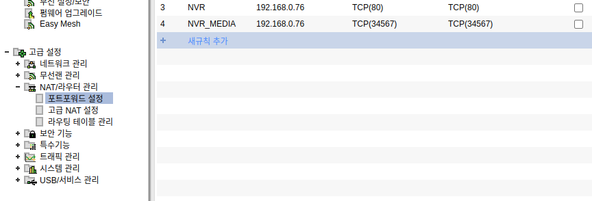 IPTIME 관리자 설정에 가서 고급 설정 - NAT/라우터 관리 - 포트 포워드 설정 탭에 가면 규칙을 생성할 수 있다. NVR, NVR_MEDIA 규칙 명을 입력해주고 IP에는 아까 Net Test 후 얻었던 내부 IP 주소를 입력해주면 된다. 포트 번호는 기기에 맞게 입력해주면 되는데 이 기기의 경우 34567이었다.