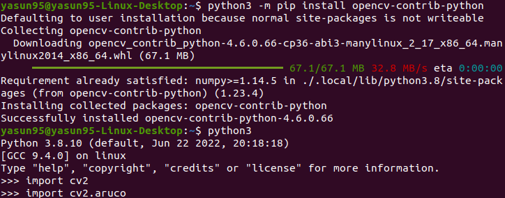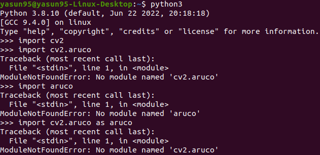 설치를 마치고 python3에서 cv2.aruco 모듈을 불러오면 에러가 사라지는 것을 볼 수 있다.