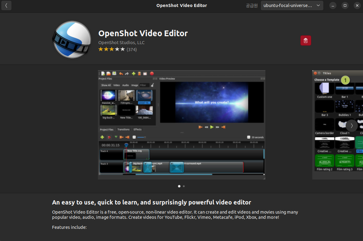 오픈샷의 장점은 무겁지 않고 리눅스 환경에서도 사용할 수 있다는 점이다. 개발을 위해 리눅스 환경에서 작업하고 있을 때 영상 편집만을 위해 윈도우 환경으로 재부팅할 필요가 없다는 것이다.