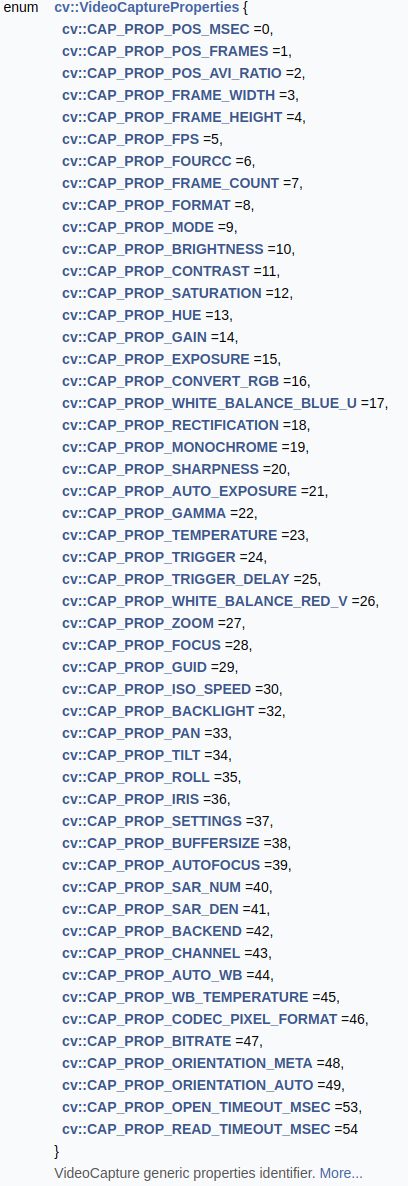 CAP_PROP는 OPENCV의 Video I/O의 플래그 형식 중 VideoCaptureProperties의 enum으로 정의되어있다. OPENCV DOCS에서 어떻게 정의되었는지 확인할 수 있다.