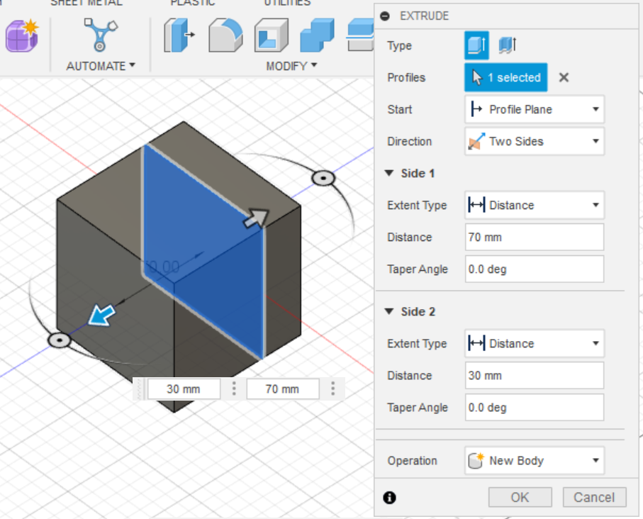 Side1과 Side2 항목이 따로 생성되어 양쪽에 얼마나 Extrude 할지 Distance 값을 따로 설정할 수 있다.