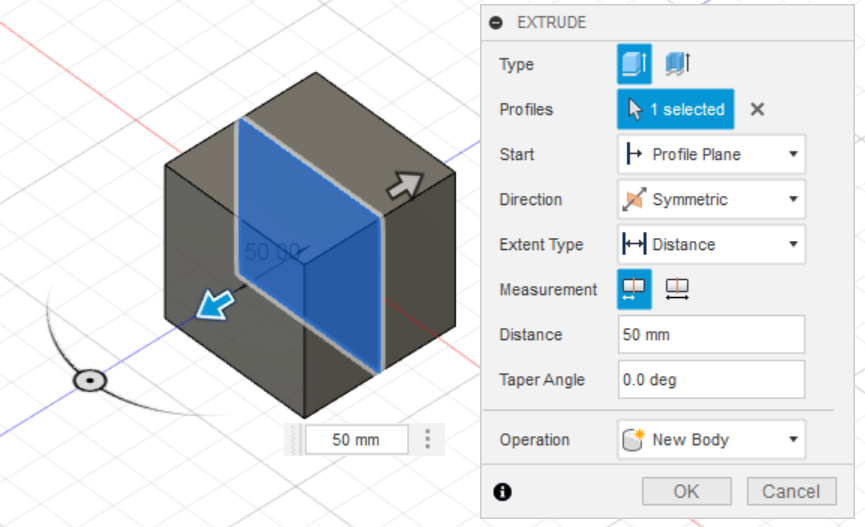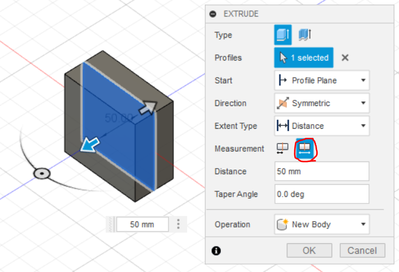 여기서 추가로 하나 설명할 것이 있다면, Measurement에 Half Length와 Whole Length 기능이 있다는 점이다. Half Length는 사용자가 설정한 Distance 값을 양쪽에 각각 반영하여 50mm, 50mm 총 100mm Extrude 하는 기능이고, Whole Length는 사용자가 설정한 Distance 값만큼 양쪽에 값을 주겠다는 의미이다. 즉, Whole Length 값이 되는 Distance 값을 50mm만큼 주었기 때문에 양쪽에는 50mm/2 , 50mm/2 씩 값으로 Extrude 된다.
