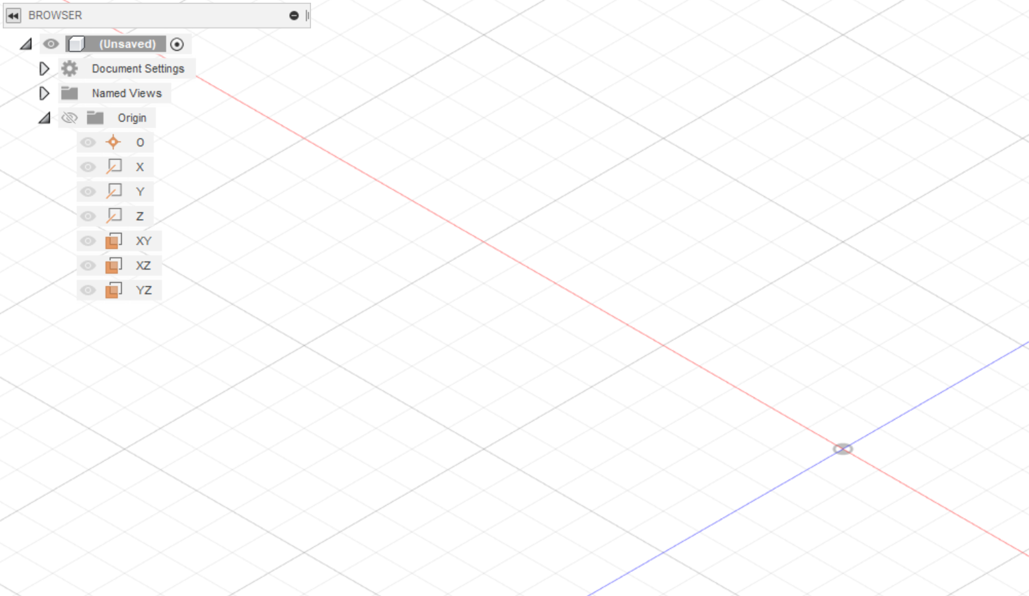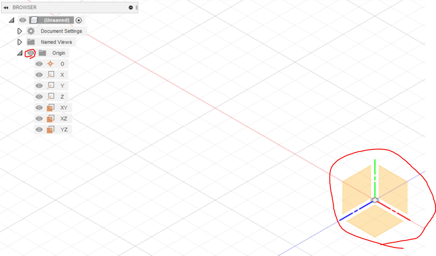 원점과 평면을 보이는 상태로 변경하고 싶다면, 좌측 상단 트리에서 눈 모양 아이콘을 선택하면 원점, 평면을 눈으로 보면서 작업할 수 있다. 스케치를 위해 평면을 선택하거나 기능을 추가하기 위해서 평면을 선택할 수 있다.