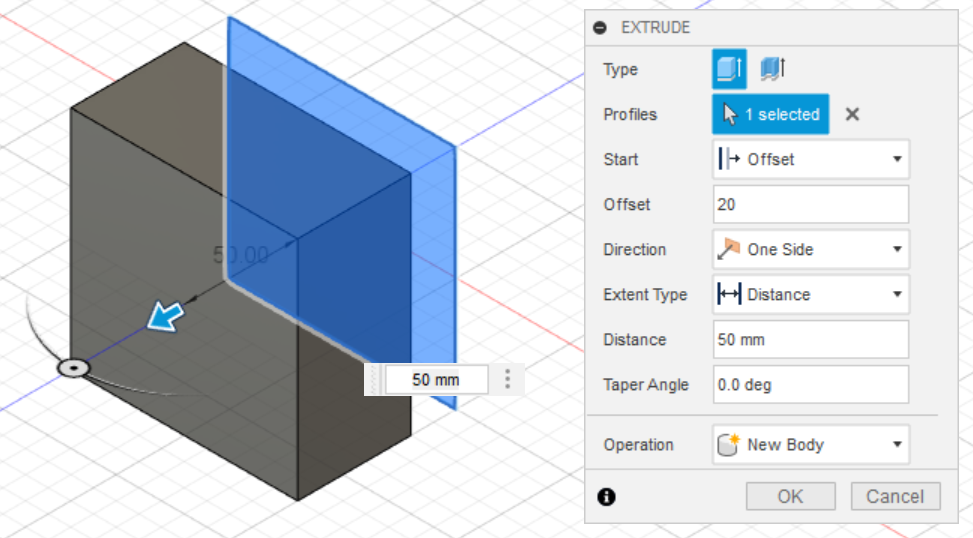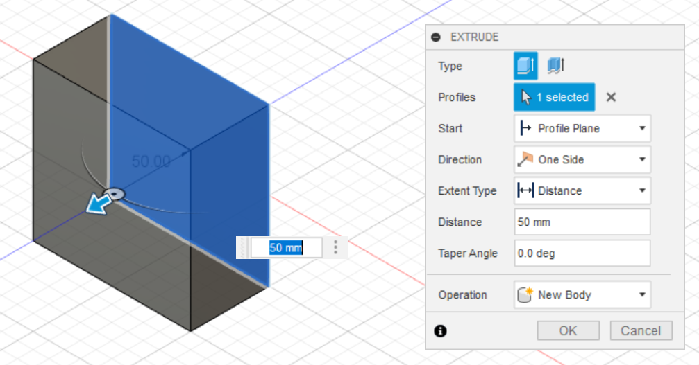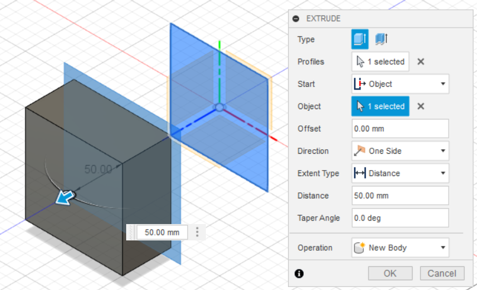 ◎ Start - Profile Plane : 기존 사용법이다. Start는 Extrude의 기준을 어느 부분으로 선택하느냐이다. Profile Plane은 말 그대로 우리가 Profile로써 선택한 사각형으로 Extrude를 할 수 있다는 것이다. 다른 항목들은 건드리지 말고 Distance 만 50mm로 변경해보자.