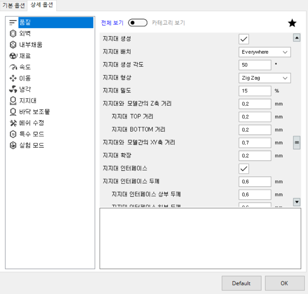 채우기 형상은 내부 형상을 의미하는데 출력할 때만 어떤 형상인지 알 수 있고 출력이 완료되면 내부가 TOP, BOTTOM 레이어로 가려지기 때문에 확인할 수 없다. 옵션은 (필자 기준) Cubic을 많이 사용했는데 어느 사이트에서 권장하는 설정을 가져와봤다.