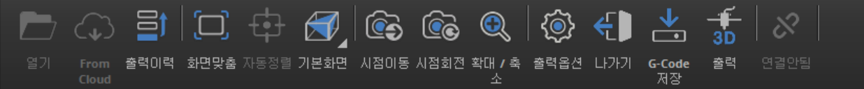 Cubicreator는 Cubicon 사에서 개발한 3D 프린팅 슬라이서 프로그램으로 3D 형상을 로드하여 출력 옵션, 출력 준비 과정을 통해 G-CODE 파일로 변환해준다. 위 사진은 Cubicreator의 메인 화면 상단의 기능들이다. 일반적인 슬라이서는 .stl, .stp와 같은 확장자 파일을 드래그하면 배드위에 작업물이 생성된다.