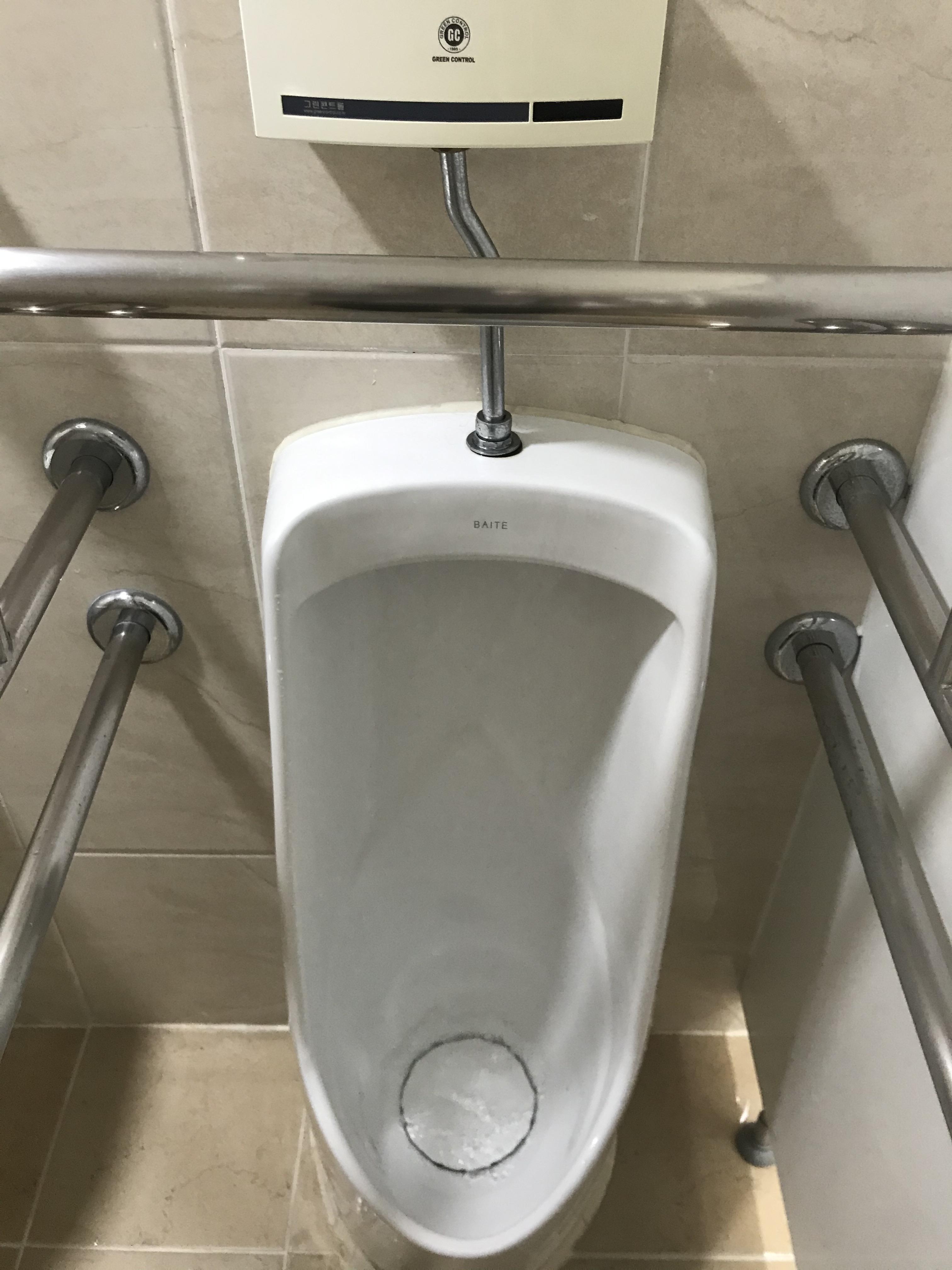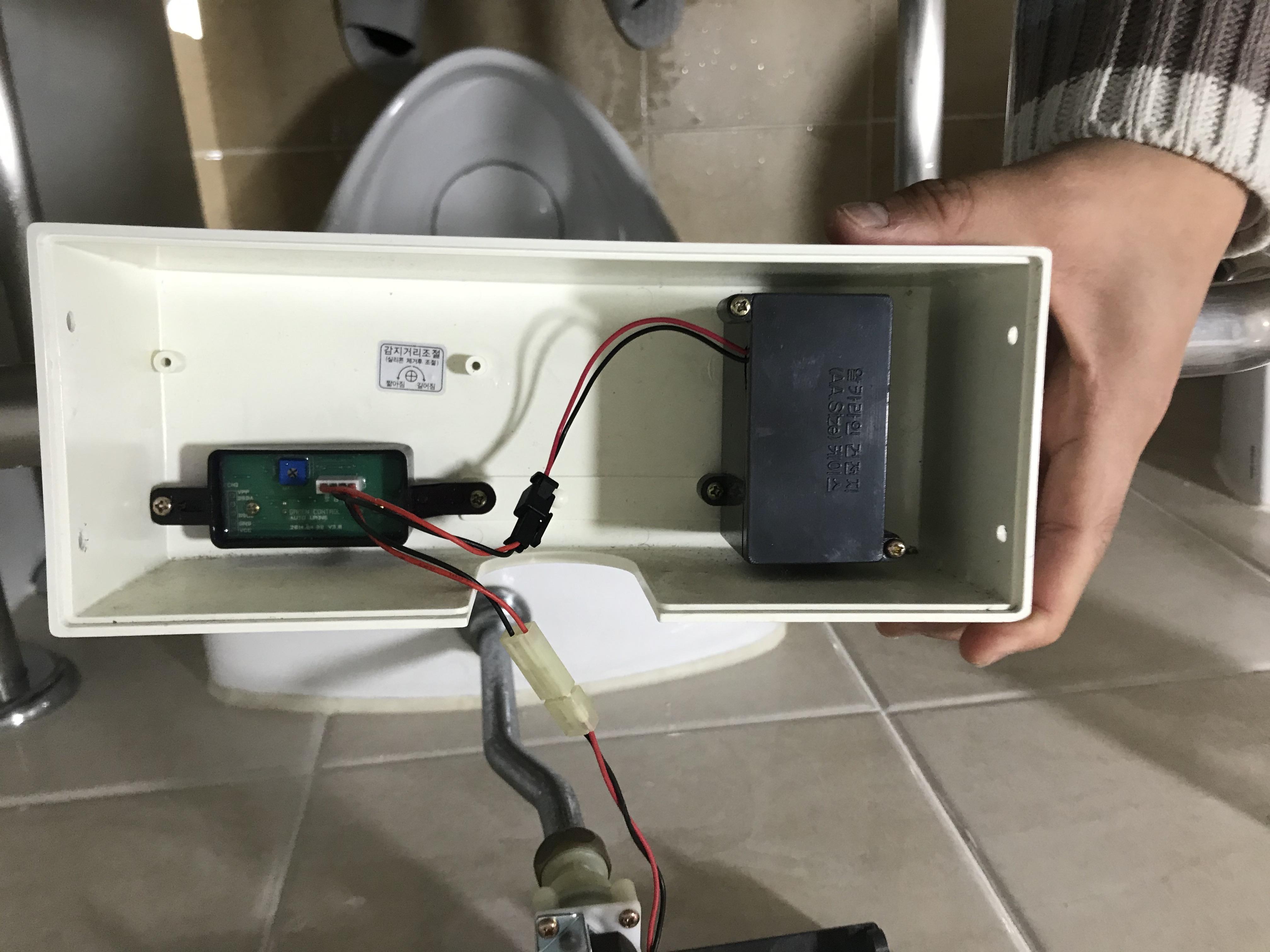 일상생활에서 자주 보이는 평범한 소변기이다. 어느 순간부터 물 내려가는 소리가 안 들렸고 오른쪽 센서부에 빨간 불이 들어오지 않는다. 아래층 선생님께서 전지만 교체해주면 대개 고쳐진다고 얘기를 들어서 전지를 갈아 끼웠으나 작동하지 않았다.