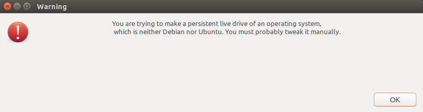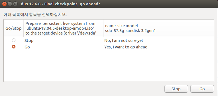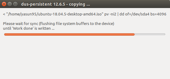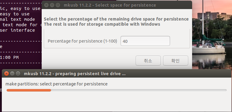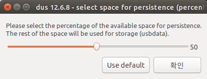 에러 발생인줄 알았는데 간단한 경고문구였다. mkusb가 알아서 진행해주니 확인을 눌러주면된다. 영구적으로 사용할 메모리를 스스로 할당하게한다. 당당하게 100을 써넣었다가 1시간동안 진행되지 않아서 40으로 낮추었더니 되는거 같다.