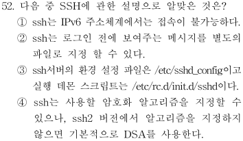 ③ /etc/sshd_config (X) ☞ openssh 패키지를 이용하여 사용할 수 있으며 환경 설정 파일은 /etc/ssh/sshd_config이며 실행 데몬 스크립트는 /etc/rc.d/init.d/sshd이다.