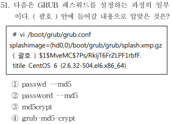 문제에서 알 수 있는 것은 현재 vi 편집기로 /boot/grub/grub.conf 부팅 환경설정 파일의 내용을 출력하고 있다는 점이다. 다음 줄은 splash image 설정이며 그다음 줄에는 이상한 문자열이 나온다. 이는 터미널 창에서 grub에 진입하여 md5crypt 명령어를 입력했을 때 볼 수 있는 암호화 형태의 비밀번호이다.