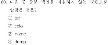 ① tar(tape archive) ☞ 파일이나 디렉토리를 하나로 묶어 아카이브 파일을 생성하는 명령어, 묶이기 전 파일들의 속성과 심볼릭 링크, 디렉터리 구조 등을 그대로 가져갈 수 있는 특징이 있다. tar -g 옵션으로 증분 백업을 할 수 있다.