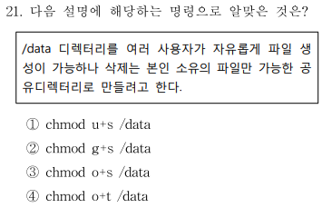 디렉터리와 파일의 소유자로는 User(사용자)와 Group(그룹), Other(다른 사용자)로 나뉘는데 앞 철자를 따 u, g, o로 표현한다. 기본적으로 Read(읽기), Write(쓰기), Execute(실행) 세 가지의 권한 옵션이 있으며, 특수 권한으로 SetUID(소유자), SetGID(그룹 소유자)의 앞 철자 s가 있고 Sticky Bit(공유 디렉터리)의 t가 있다. t 옵션의 경우 공유 디렉터리 안에서 생성한 파일은 소유권이 생성한 사용자에게 있어 삭제 또한 파일을 생성한 사용자만 가능하다. 그래서 위 문제에서 알 수 있는 것은 세 가지이다.
