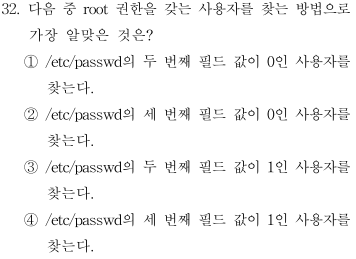 정답 ☞ ② /etc/passwd의 세 번째 필드 값이 0인 사용자를 찾는다.