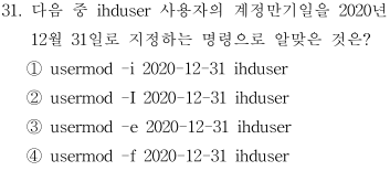 ③ usermod -e 2020-12-31 ihduser ☞ 계정 만기일을 변경한다. YYYY-MM-DD 또는 MM/DD/YY의 형식으로 변경할 수 있다.