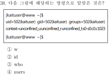 UID, GID, 사용자 계정이 속해 있는 그룹 정보를 확인할 수 있다. UID가 502인걸 봐서 kaituser는 일반 유저로 출력되고 있다. root 계정으로 id 명령어를 입력하면 다른 내용이 출력되고 일반 유저 kaituser가 직접 출력한 경우에는 문제와 같이 출력된다.