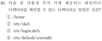 ④ /etc/default/useradd ☞ 새 계정을 생성할 때 제공되는 파일이나 디렉터리를 확인할 수 있다.