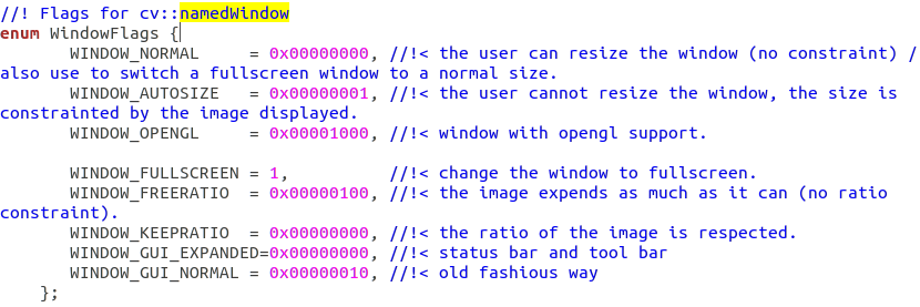 cv::namedWindow는 창을 띄워주는 gui에 관련된 함수로 highgui.hpp 파일에서 함수에 대해 찾아볼 수 있다.