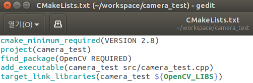 코드 작성을 마무리했다면 workspace/camera_test/src 디렉터리에 있을 것이다. 터미널 창에서 cd .. 를 입력하여 상위 디렉터리인workspace/camera_test 로 돌아오고 편집기로 CMakeLists.txt 를 작성하자.